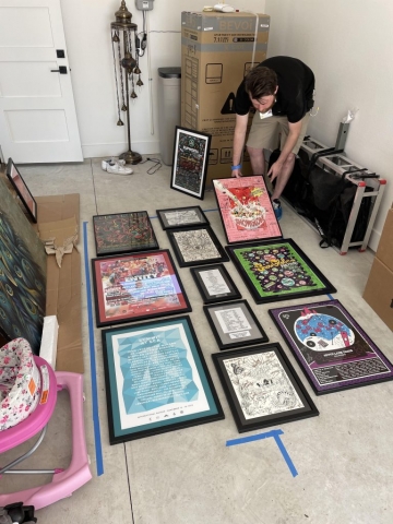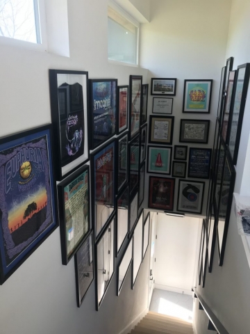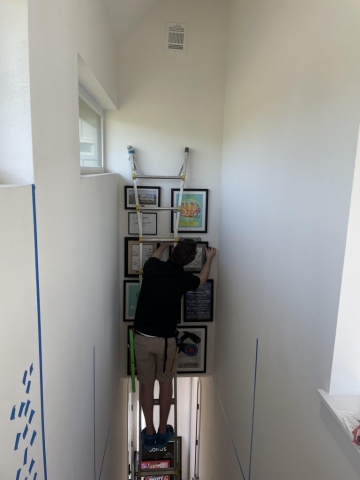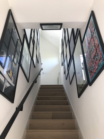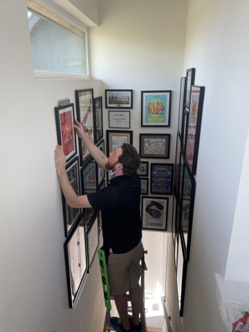 This Central Austin resident needed design and placement for 60 pieces of various shapes, sizes and hardware types, in their 18 foot narrow staircase. Our team came up with the layout of the artwork and mapped it out prior to installation. The project took half of the day but the end result turned out incredible!