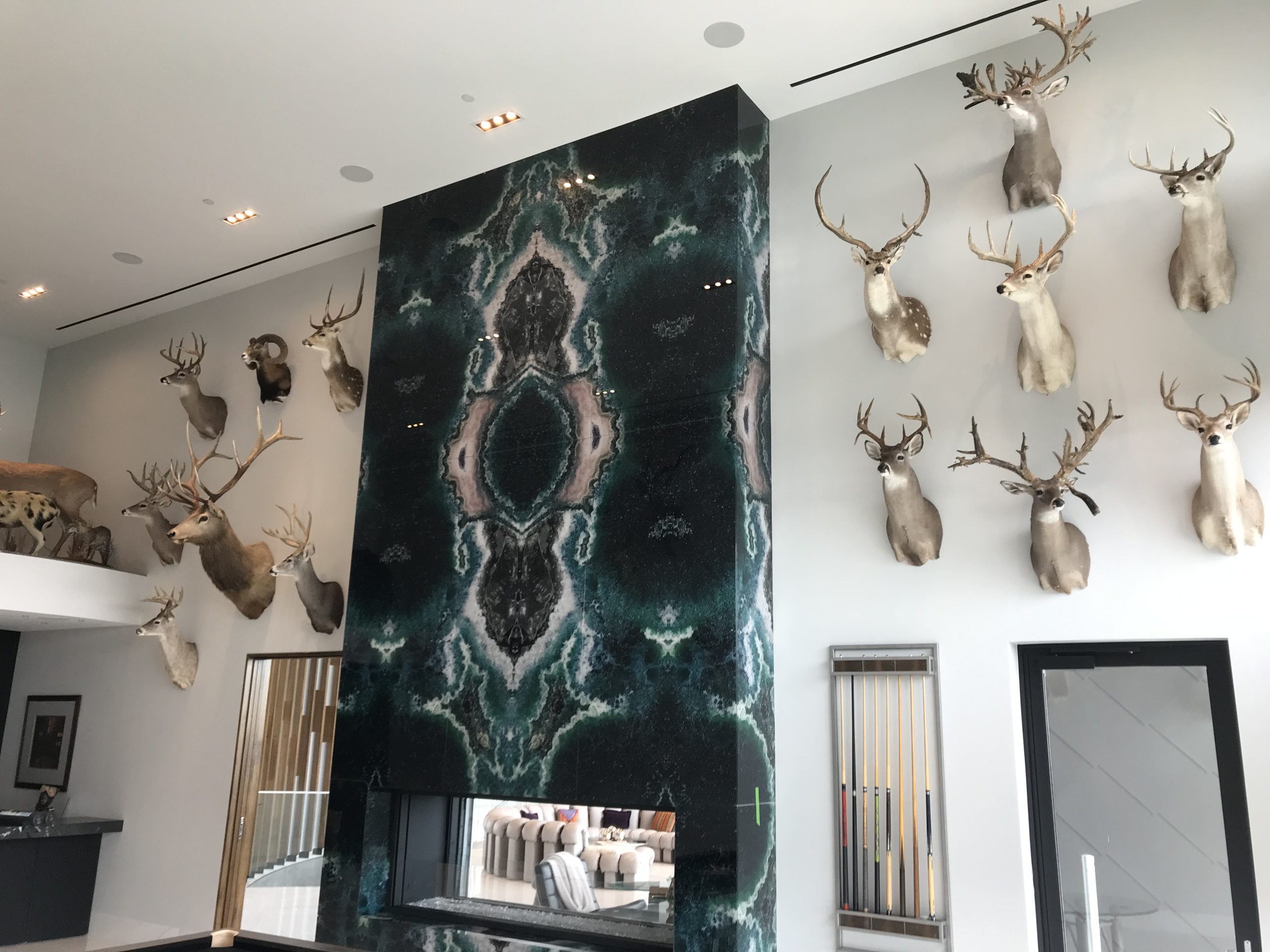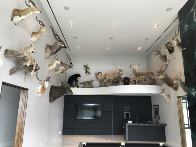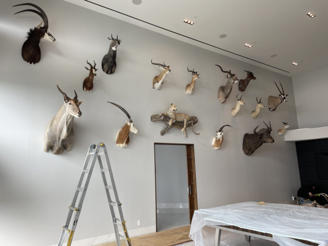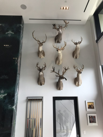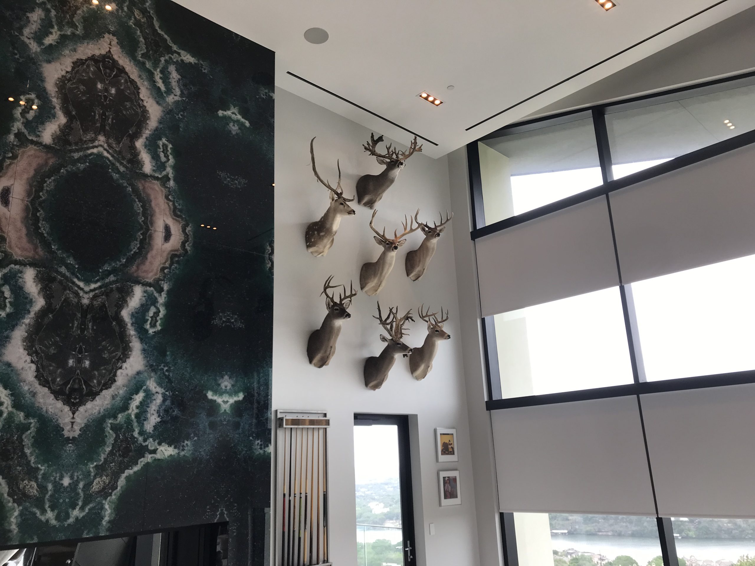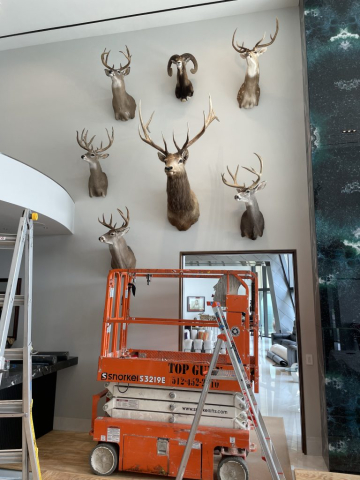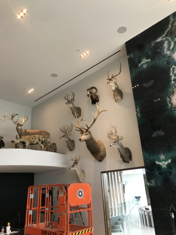 Recently, our Austin team had the pleasure of installing 50 high game shoulder mounts, the week prior we laid each mount out in the garage and took our measurements necessary to make the install go as smooth as possible. The install took roughly 3 days, our team laid out floor protectors and rolled a skyjack into the house, making the install a breeze! Completely transforming their game room/ bar.